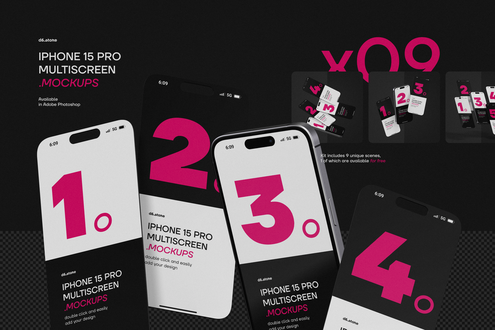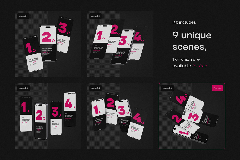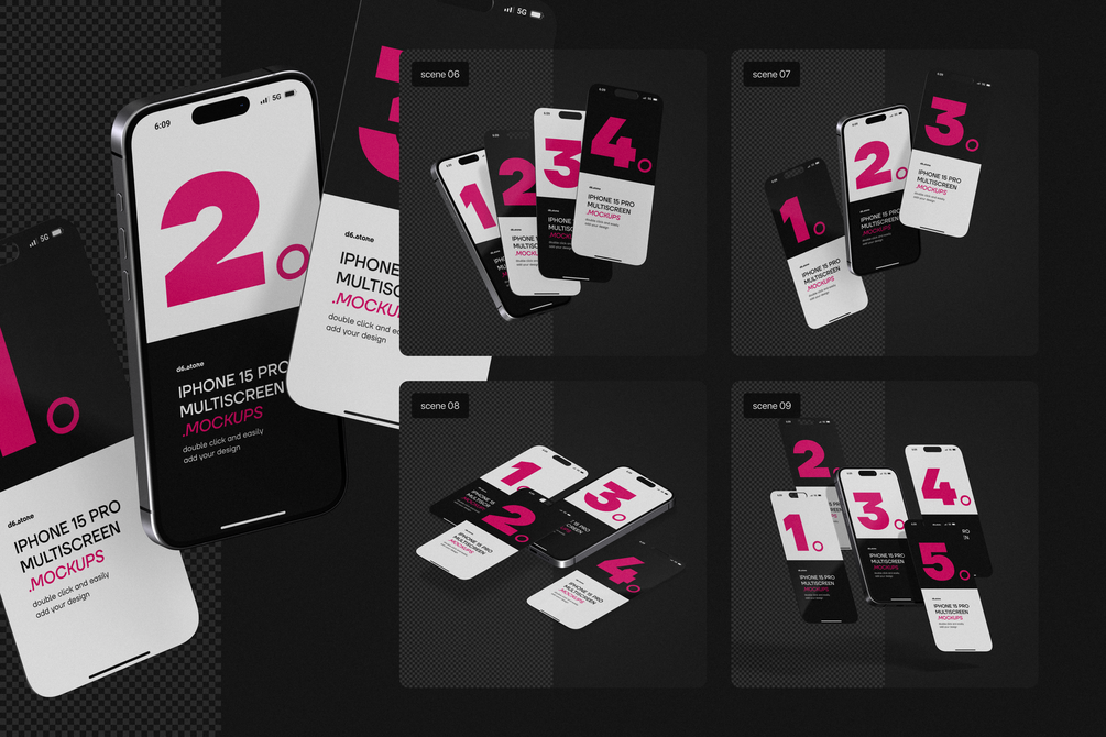 9 unique scenes, including 1 free one for those who are unsure about buying the full set and want to try our product. Each scene is available in PSD format. Customizable light shading and backgrounds. Give your product a professional look with our versatile set!